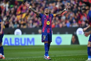 体育资讯3月16日讯 西甲第28轮,巴萨主场迎战塞维利亚,拉菲尼亚首发出战,上演帽子戏法。