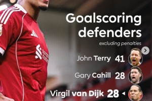 英超历史后卫非点球进球榜:特里居首,范戴克追平卡希尔并列次席